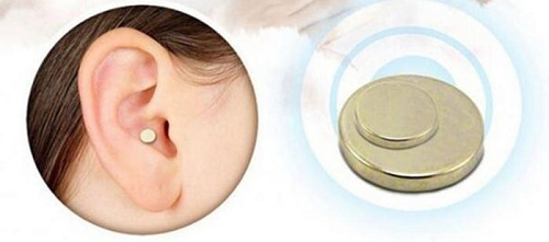 1. Using your dry fingers, the smaller magnet is placed on the front of the ear while the larger one is placed just opposite behind the ear. Initially, the magnets are placed on the upper left ear (See picture for the extract point), but can be switched to the other ear or select the Alternative lower point (See picture).