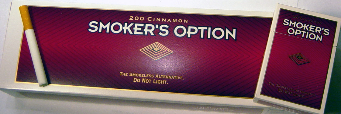 Smoker's Option is a rewarding, Smokeless, Non-tobacco cigarette alternative for situations where you can't, or choose Not to smoke. Do not light Smoker's Option, simply draw on it like a cigarette. There is no tar or nicotine, just a pleasing cinnamon taste. It looks and feels like a cigarette, but it contains no tobacco, no tar, no nicotine. Just enjoyable flavor Cinnamon.
